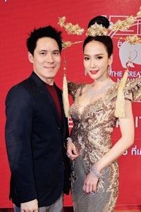 two people posing in front of a poster of thailand