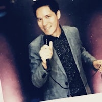 a man in a suit standing in front of a banner that says bu la fiesta